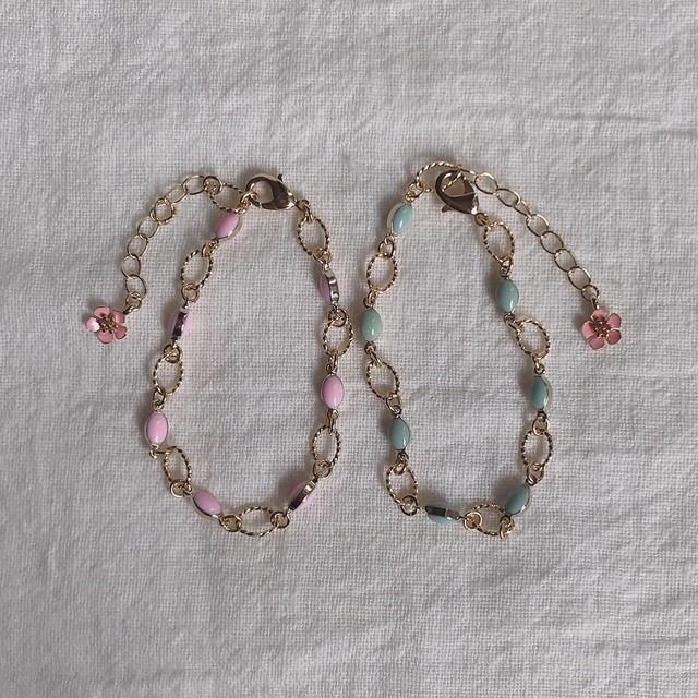 キャンディみたいなコロッとしたパーツが可愛いブレスレット。 一つ一つパーツを繋げてお作りしました。 爽やかなパステルブルーとピンク。 アジャスター部分にはピンクのお花を❁ ブルー or ピンク サイズ:約16.5cm(+3cmアジャスター) ⚠︎金属アレルギーの方やメッキ加工がお肌に合わない方はご購入をお控えください。
