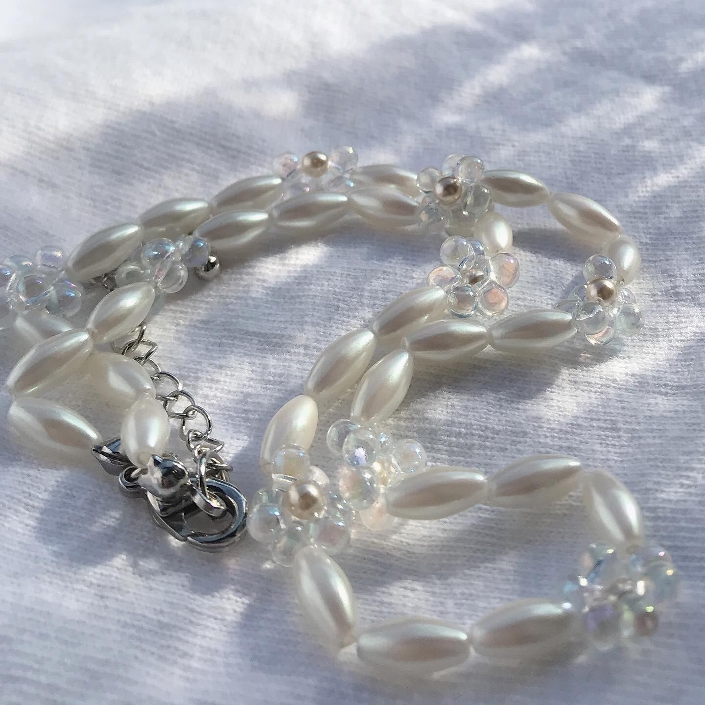 樹脂パールの間にドロップビーズでお花モチーフを作りました❁